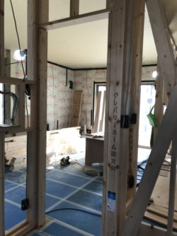 内部は断熱材が入って大工さんが一生懸命に木工事中でございます。