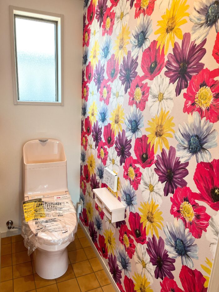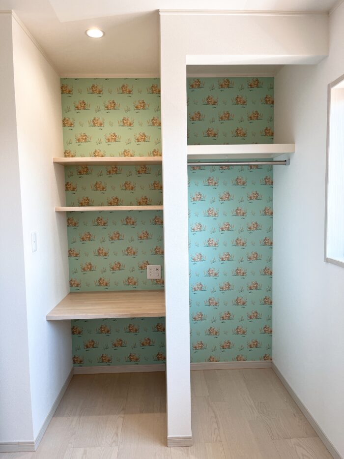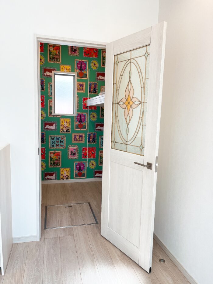 パントリーには鮮やかなクロスとLIXILの建具を使用しました。