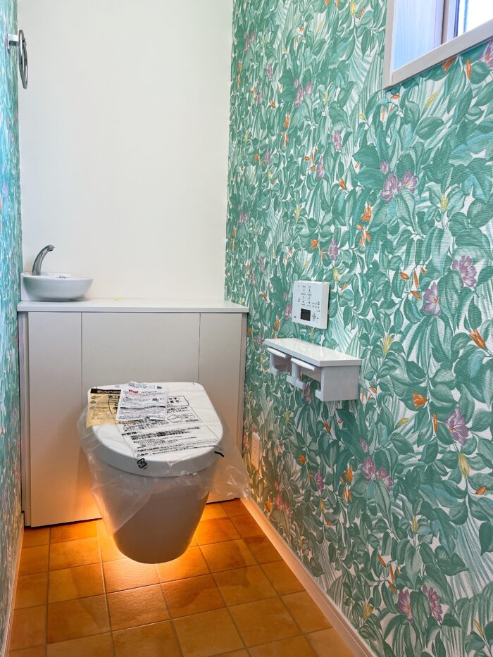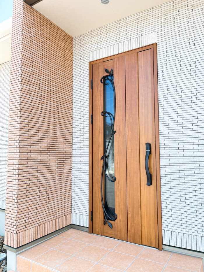 シューズクローク内はタイル柄のアクセントクロスを貼り、入り口の下がり壁はアーチにしました!