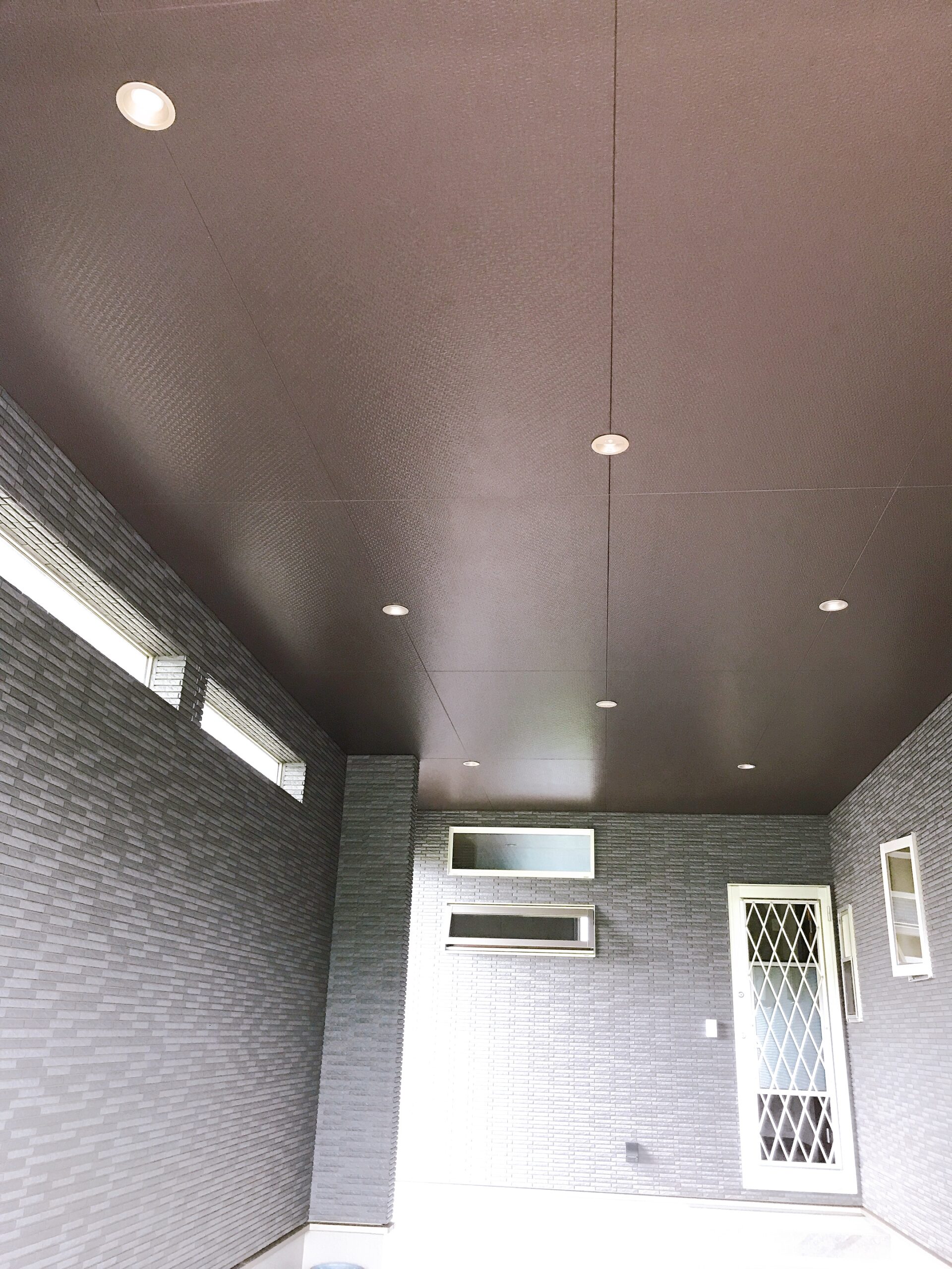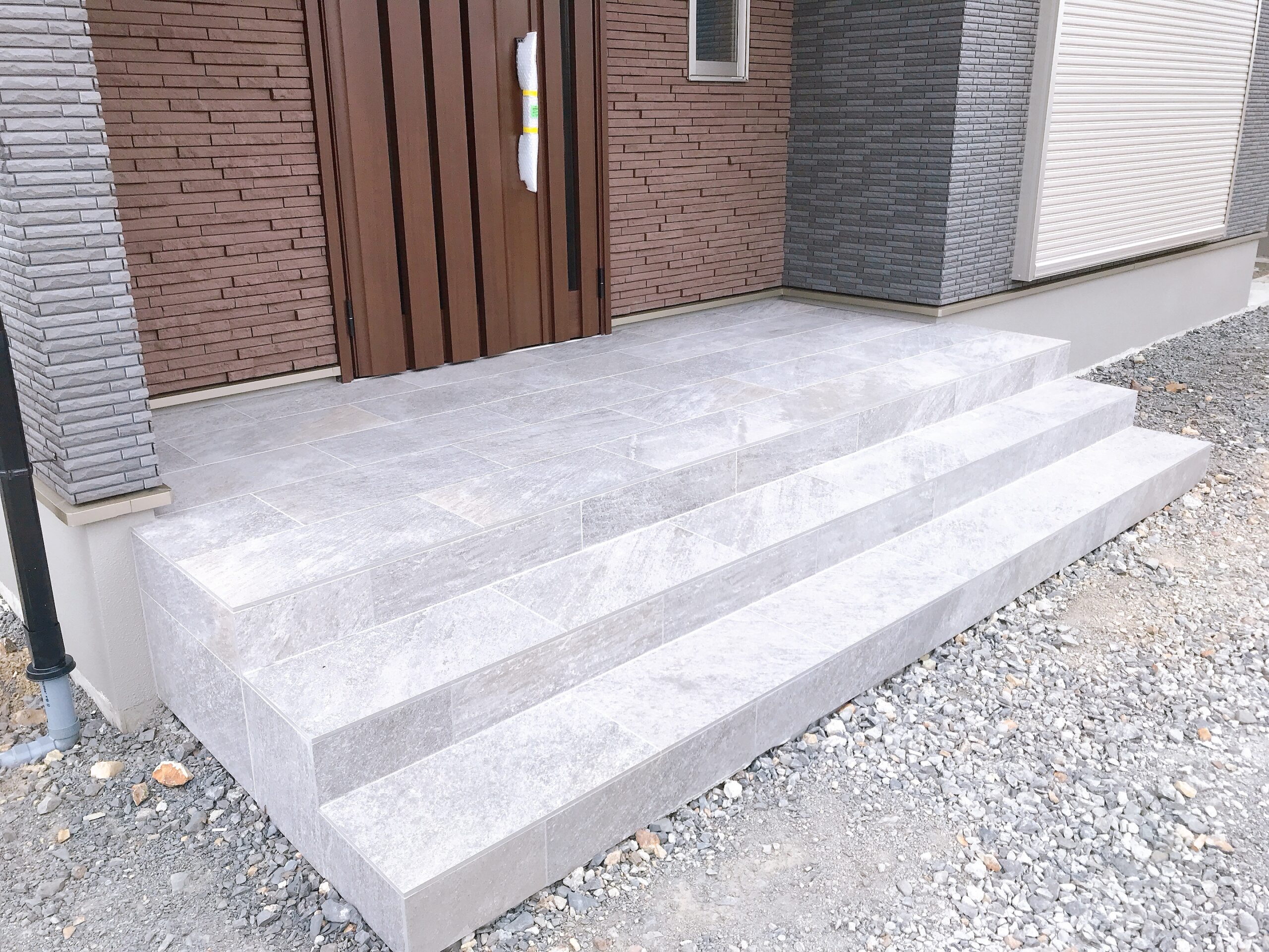 黒のタイルを基調に、凹凸の存在感と高級感を兼ね備えたアクセントタイルが玄関を彩ります。