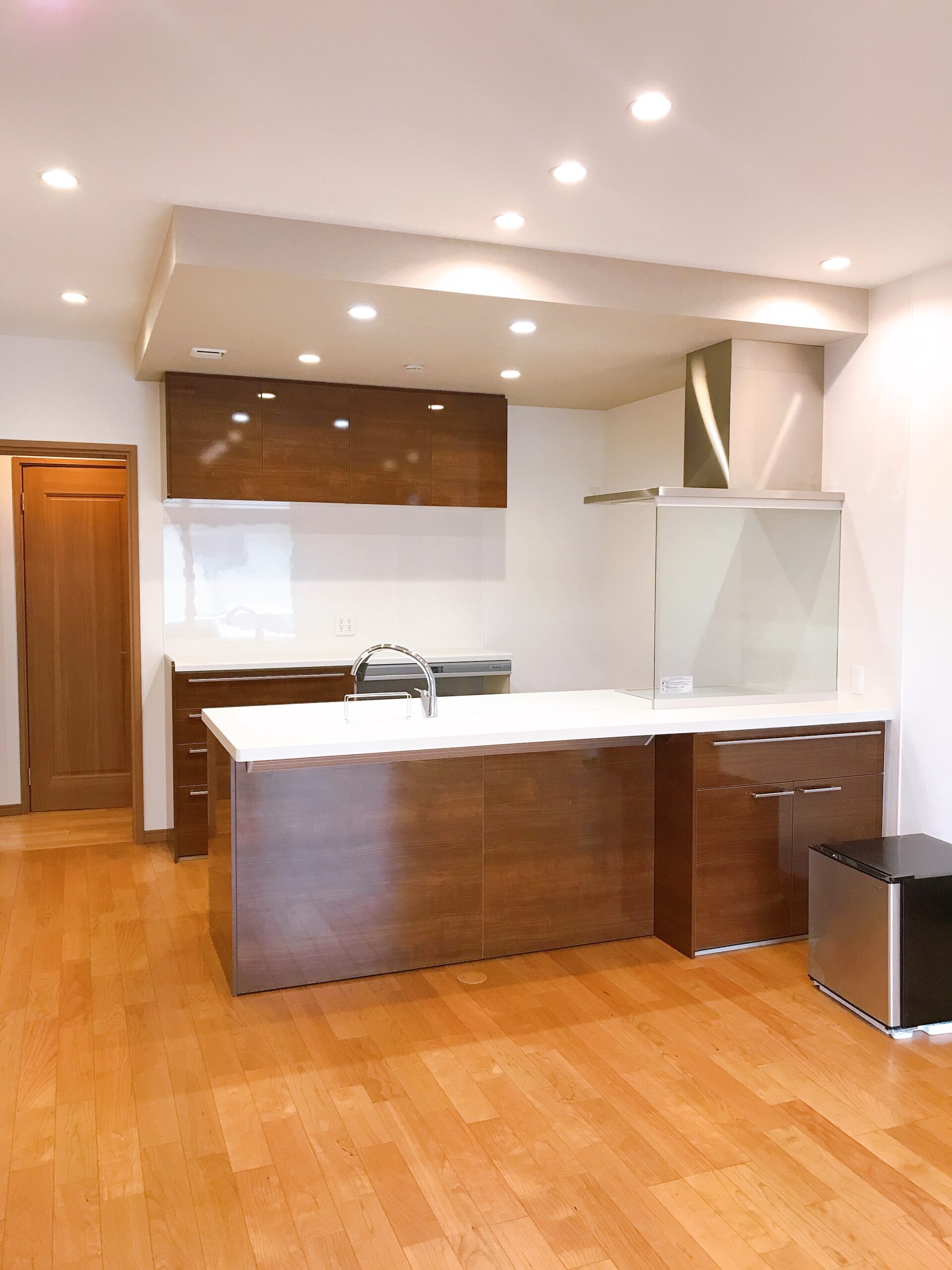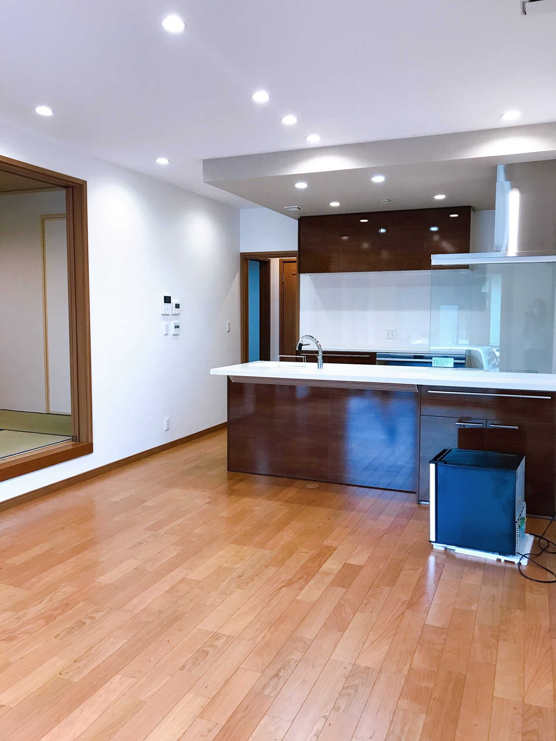 落ち着いた床色に温かみのあるチェリー柄キッチン。