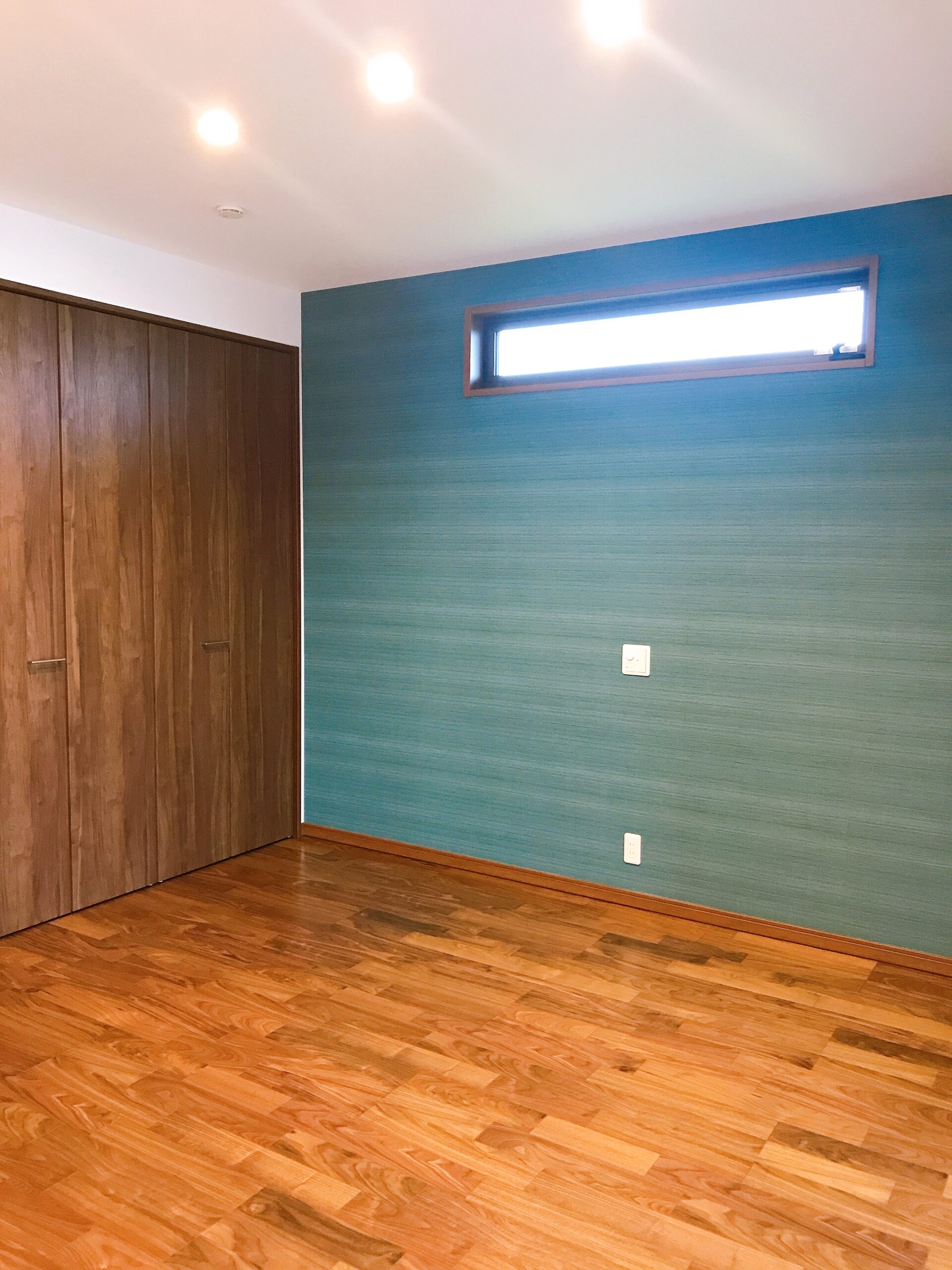 鮮やかなブルーの壁紙や石目の柄クロスなど、各お部屋にもお施主様のこだわりが詰まっています。