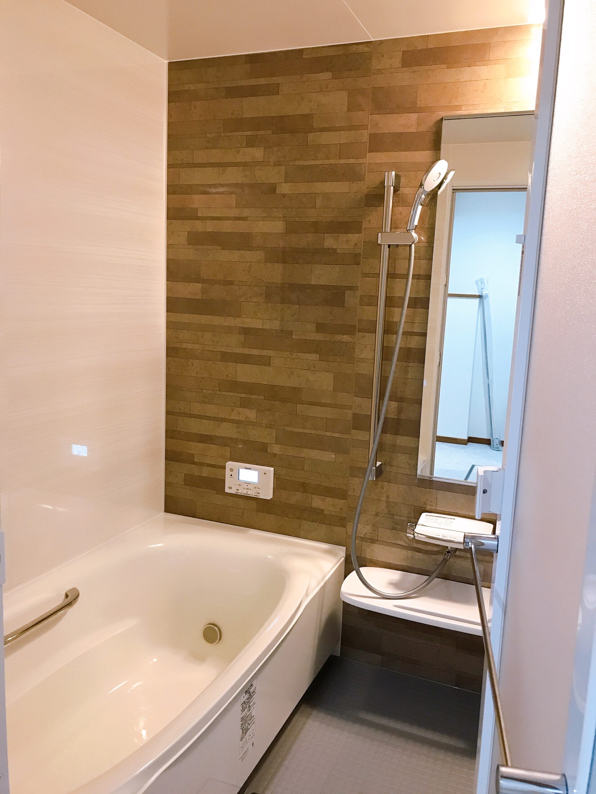テレビ背面の壁には、石材の意匠が落ち着いた印象を与えるエコカラットを。