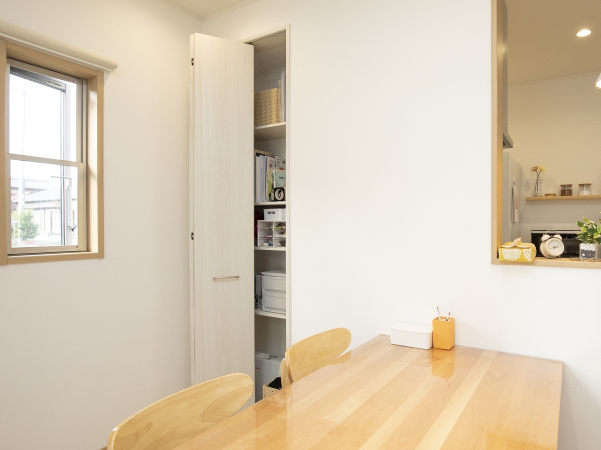 ダイニングにはデッドスペースを使って、書類や小物用の収納を作りました。