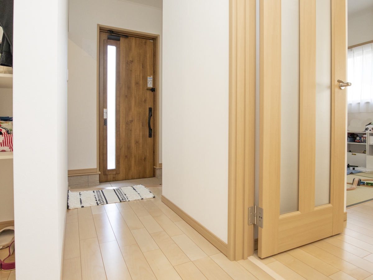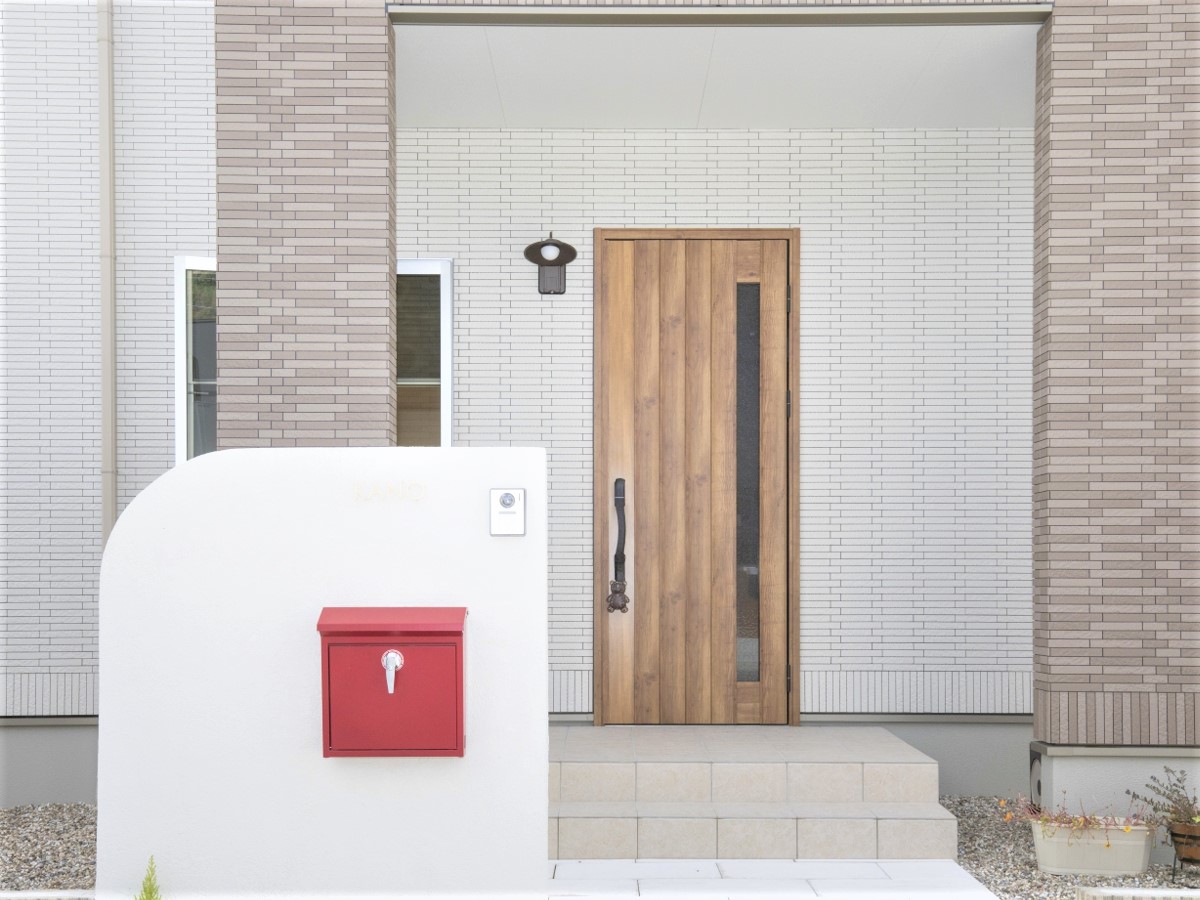 木目調の玄関ドアがよりナチュラルな雰囲気を演出しています。