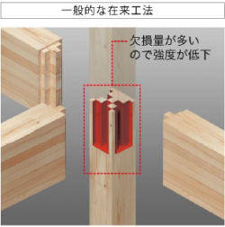 一般的な在来工法に比べ接合部の欠損量を大幅に削減でき、