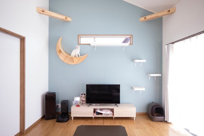ご主人とクレバリーホームのスタッフが協力して取り付けたキャットウォークで、猫ちゃんがくつろぐ様子を眺めながらリビングで過ごせます。