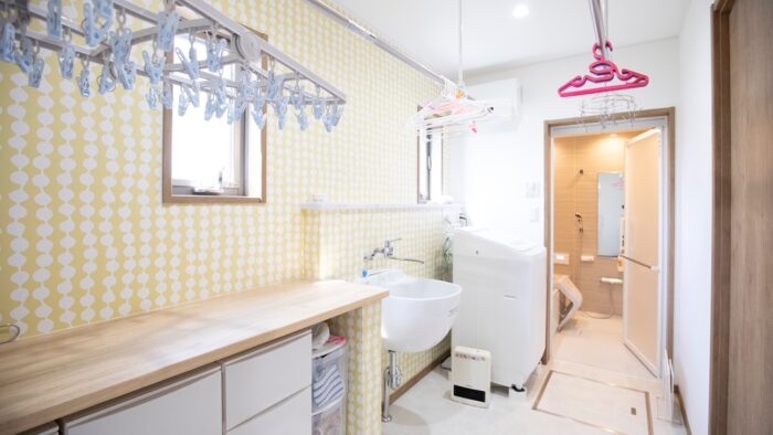 洗濯物は室内に干すというM様のライフスタイルに合わせて、お風呂の横に家族全員分の洗濯物も余裕で干せるランドリースペースを確保。