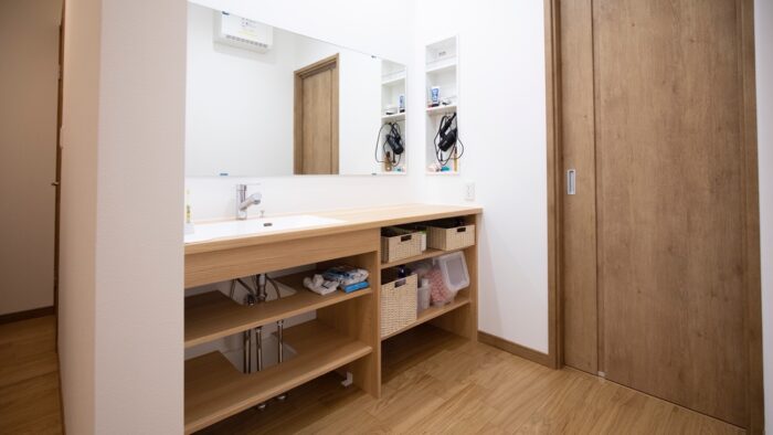 家族の人数が増えると、朝のお出かけ前に洗面コーナーの場所がどうしても混みがちに。家族4人暮らしのM様邸には、こうした朝の洗面前渋滞を避けるため、オーダーメイドの造作洗面台をお作りしました。