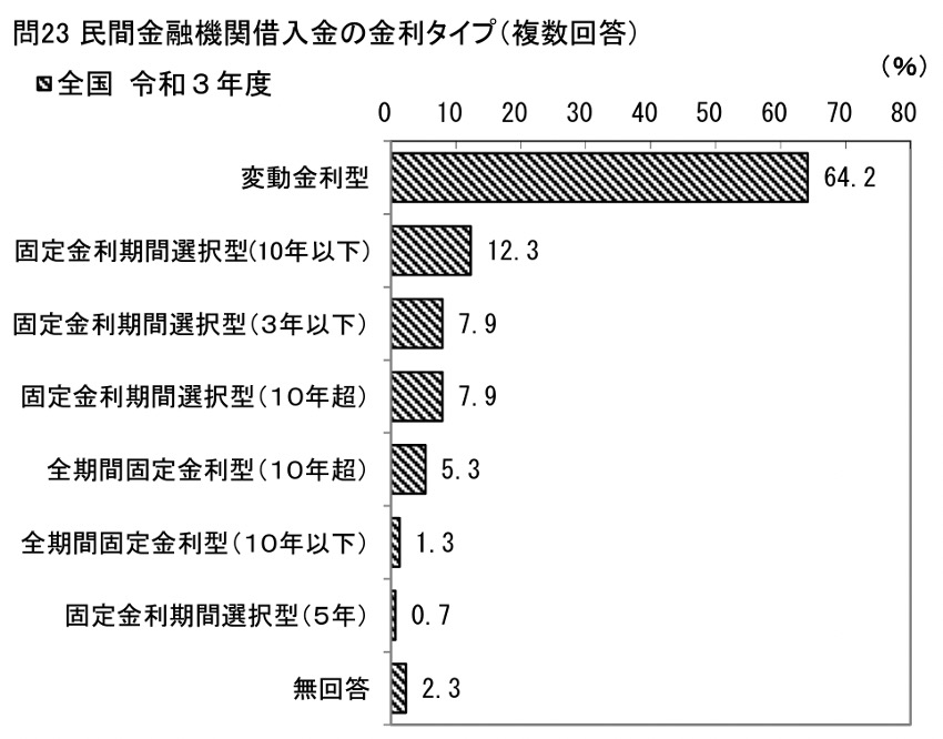 民間金融機関からの住宅ローンの金利タイプは、「変動金利型」が最も多く、全国で64.2%(前年度比7.2%増)。