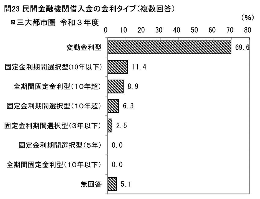 ちなみに、三大都市圏でも民間金融機関からの住宅ローンの金利タイプは、「変動金利型」が最も多く69.6%(同比3.5%減)でした。