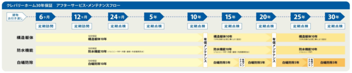 クレバリーホーム可児店では法律で定められている10年間の住宅保証(瑕疵保証)に加え、独自のアフターサービスとメンテナンス保証で、30年間の安心をお約束しています。