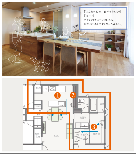 家事の負担を減らすには一つひとつの家事で動く量を減らすことが大切。アイランドキッチンや、コンパクトな洗濯動線を採用して、ワンフロアーの魅力を存分に活かしました。