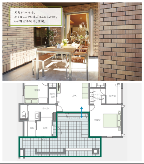 住まいの中にいつでも過ごせる非日常な空間をつくりだします。センターリビングから気軽に入れ、間取りによっては窓を全開にしてリビングとフルスペースで活用できます。 家族や友人と、休日にはBBQやパーティ、平日には、いつもの食卓とはちがうディナータイムを過ごす場所に。楽しい時間を家族とシェアできます。